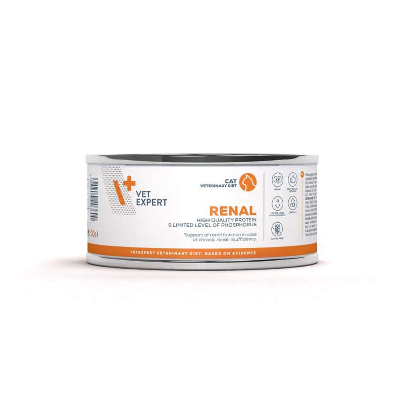 VetExpert 4T Renal – puszka dla kota – pełnoporcjowa i zbilansowana karma dietetyczna dla kotów dorosłych, przeznaczona do wspomagania funkcji nerek w przypadku jej przewlekłej niewydolności.