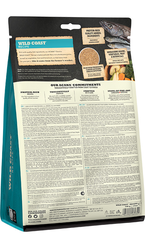 Acana Classics Wild Coast to karma która jest bogata w mięso, na 6kg karmy, wykorzystuje się 3kg mięsa. 1/3 to świeże mięso ryb takich jak śledź, flądra czy morszczuk. 2/3 to mięso tychże ryb, ale w formie dehydratyzowanej. Dla marki ACANA, istotnym elementem produkcji jest jakoś składników z których korzysta, dlatego ryby wykorzystywane do produkcji karmy Wild Coast pochodzą z naturalnych, zrównoważonych połowów. Ryby docierają do kuchni NorthStar® w całości, pełne smaku oraz najlepszych składników. Dopiero na miejscu, przechodzą proces w którym stają się smakowitą karmą dla psów. Poza mięsem, w karmie znaleźć można warzywa, owoce i zioła, które również stanowią element idei WholePrey™. Jednak nie znajdziemy tam wypełniaczy niskiej jakości jak ziemniaki czy tapioka.