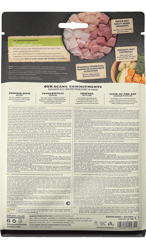 Karmy serii ACANA REGIONALS występują w 4 niezależny smakach i składach. Każda oparta jest o inne mięsa wiodące w składzie, dedykowane dla innego regionu Alberty w Kanadzie. W przypadku karmy Grasslands głównym mięsnym składnikiem są jagnięcina, kaczka i indyk, uzupełniane rybami takimi jak śledź czy szczupak. Olbrzymie zaufanie jakim cieszy się karma oparte jest o skład, w którym wyeliminowano gluten, zboża i ziemniaki. Mięso które znajduję się w karmie zawarte jest w proporcji 1/2 mięsa świeżego i 1/2 mięsa dehydratyzowanego. Co ważne, składniki mięsne kwalifikowane są jako składniki do spożycia przez człowieka. Bogata ilość mięs, aż 5, sprawia że karma zapewnia organizmowi psa zróżnicowane białka czy tłuszcze, niczym dziko żyjącemu wilkowi. Poza mięsami w karmie znajdują się owoce, warzywa i zioła. Niczym w prawdziwej diecie określanej mianem Biologicznie Odpowiedniego Jedzenia. Wszystko to aby nasz „domowy wilk” dostawała to co najlepsze: