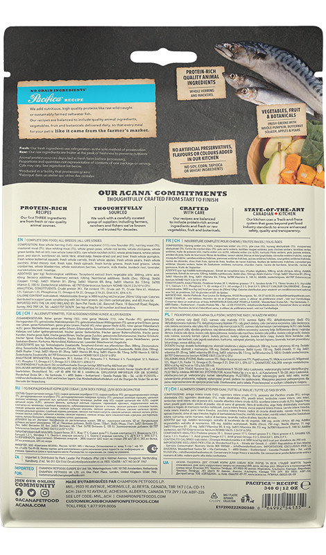 Karmy serii ACANA REGIONALS występują w 4 niezależny smakach i składach. Każda oparta jest o inne mięsa wiodące w składzie, dedykowane dla innego regionu Alberty w Kanadzie. W przypadku karmy Pacifica, głównym mięsnym składnikiem są ryby poławiane w naturalnym środowisku: dziki śledź, dzika sardynka, dzika flądra, dziki morszczuk i dziki karmazyn. Olbrzymie zaufanie jakim cieszy się karma oparte jest o skład, w którym wyeliminowano gluten, zboża i ziemniaki. Mięso które znajduję się w karmie zawarte jest w proporcji 1/2 mięsa świeżego i 1/2 mięsa dehydratyzowanego. Co ważne, składniki mięsne kwalifikowane są jako składniki do spożycia przez człowieka. Bogata ilość mięs, aż 5, sprawia że karma zapewnia organizmowi psa zróżnicowane białka czy tłuszcze, niczym dziko żyjącemu wilkowi. Poza mięsami w karmie znajdują się owoce, warzywa i zioła. Niczym w prawdziwej diecie określanej mianem Biologicznie Odpowiedniego Jedzenia. Wszystko to aby nasz „domowy wilk” dostawała to co najlepsze: