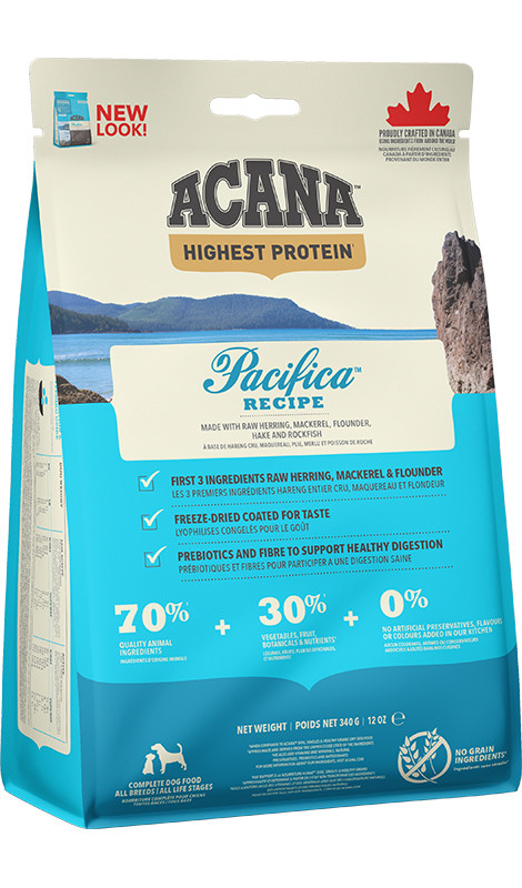 Acana Regionals Pacifica Dog to karma dla psów każdej wielkości i w każdym wieku. Oparta o 5 gatunków ryb, poławianych w regionie Alberta w Kanadzie. Bogata w białko oraz witaminy i minerały, stanowi doskonałe rozwiązanie jako główna karma dla psa