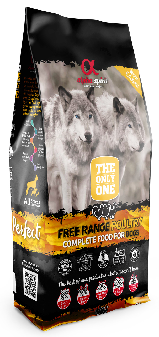 Alpha Spirit Poultry jest pełnoporcjową suchą karmą przeznaczoną dla psów dorosłych, bez względu na ich rasę i wielkość. Połączenie kurczaka, kaczki, indyka oraz ryb, przygotowane w procesie zimnego tłoczenia i zamknięte w formie smakowitego krokieta. Bez mączek, bez zbóż, bez glutenu, bez użycia ekstrudera. Jest ona doskonałym źródłem niezbędnych składników odżywczych w diecie Twojego psa. Cechuje ją wysoka zawartość składników pochodzenia zwierzęcego, wzbogacona odpowiednio dobranymi składnikami roślinnymi.
