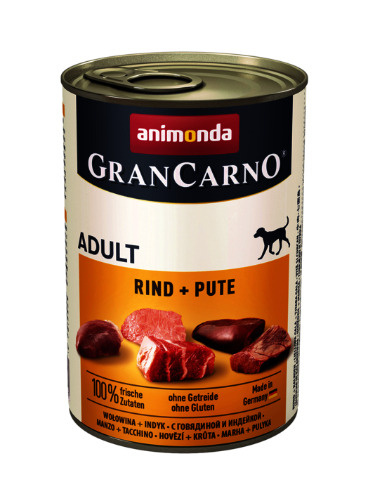Animonda GranCarno Adult Wołowina z Indykiem – przystosowana do żywienia dorosłych psów między 1-6 rokiem życia. Dwa źródła białka zwierzęcego zapewniają komplet niezbędnych aminokwasów. Co ważne, skład karmy jest jasny i klarowny, znajdują się w niej całe kawałki mięsa: bardzo cenne mięso mięśniowe, płuca, serca, wątroba. Animonda zapewnia wszystkie niezbędne składniki, takie jak witaminy, przeciwutleniacze, sole mineralne. Dodatkowo produkt jest pozbawiony wszelkich sztucznych dodatków i konserwantów i stanowi pełnowartościowy, zdrowy posiłek. Również brak zbóż, soi i cukrów wpływa na jakość produktu.
