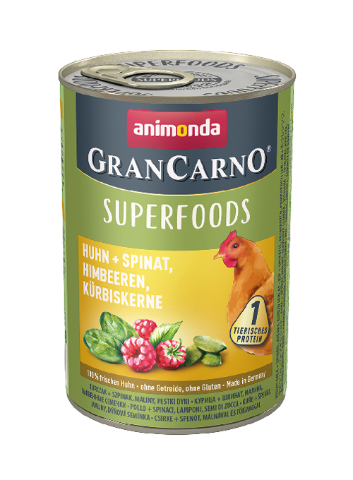 Animonda Grancarno Superfoods Adult Kurczak, Szpinak, Maliny, Pestki Dyni – mokra pełnoporcjowa karma, bez zbóż dla dorosłych psów wszystkich ras.