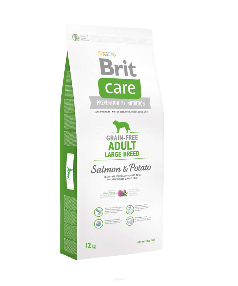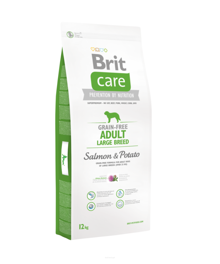 Jednym z produktów marki, jest sucha karma dla psów Brit Care Adult Large Breed Salmon & Potato. Z pewnością jest ona dobrym rozwiązaniem dla wszystkich dorosłych psów ras dużych i olbrzymich. Ponieważ kompozycja karmy opiera się głównie o łososia, który stanowi 35% składu. Przekłada się to finalnie na 25% zawartość surowego białka i 15% tłuszczu w karmie.