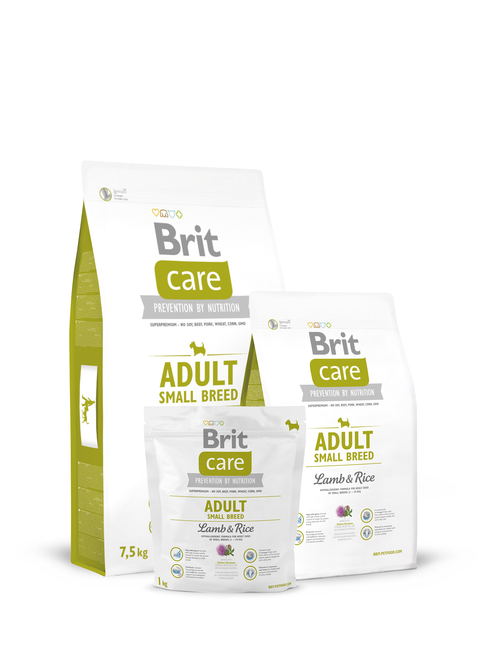 Jednym z produktów marki, jest sucha karma dla psów Brit Care Adult Small Breed Lamb & Rice. Dedykowana jest dla dorosłych psów małych ras, czyli do 10kg. Ponieważ kompozycja karmy opiera się w 40% o jagnięcinę, przekłada się to finalnie na 28% zawartość surowego białka i 17% tłuszczu w karmie.