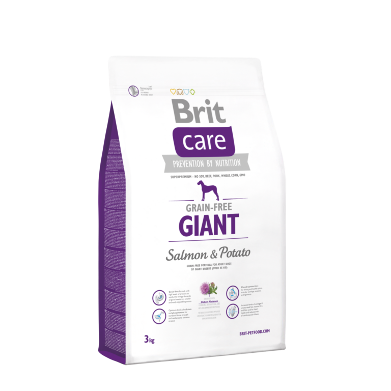 Jednym z produktów marki, jest sucha karma dla psów Brit Care Giant Salmon & Potato. Z pewnością jest ona dobrym rozwiązaniem dla wszystkich dorosłych psów ras olbrzymich, czyli powyżej 45kg. Ponieważ kompozycja karmy opiera się głównie o łososia, który stanowi 35% składu. Przekłada się to finalnie na 28% zawartość surowego białka i 16% tłuszczu w karmie.