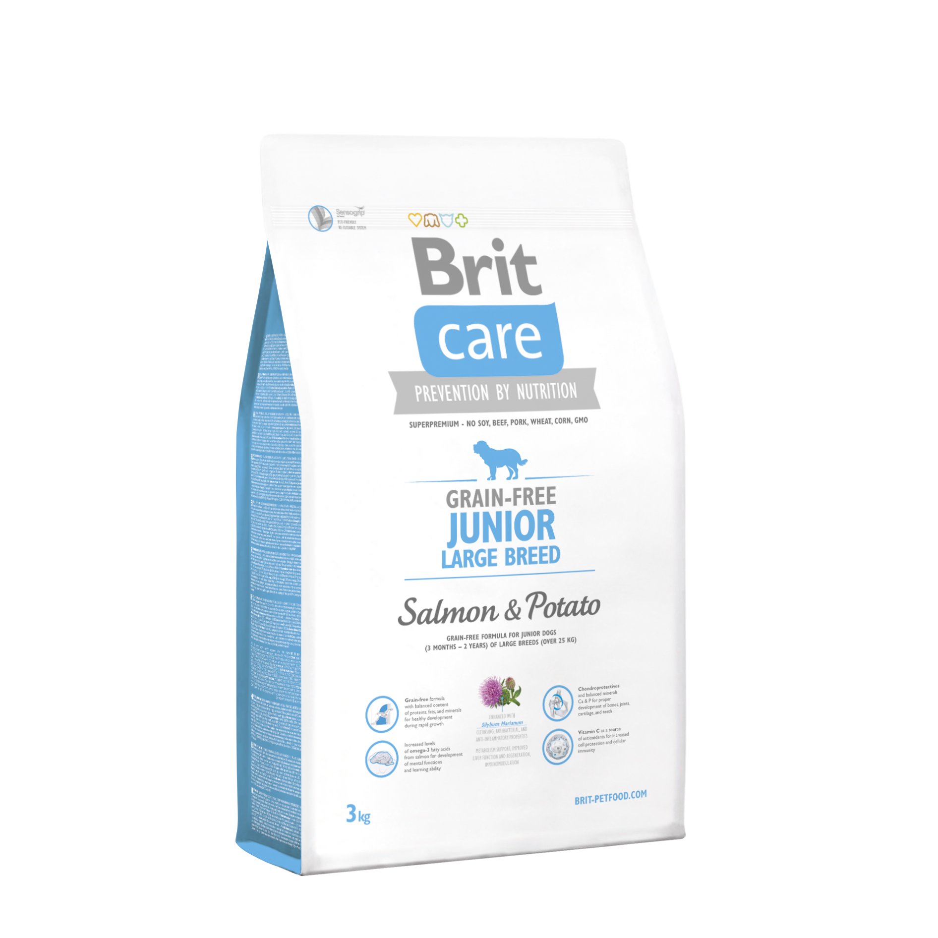 Jednym z produktów marki, jest sucha karma dla psów Brit Care Junior Large Breed Salmon & Potato. Z pewnością jest ona dobrym rozwiązaniem dla wszystkich młodych psów dużych ras od 3 miesięcy do 2 lat. Ponieważ kompozycja karmy opiera się głównie o łososia, który stanowi 35% składu. Przekłada się to finalnie na 28% zawartość surowego białka i 15% tłuszczu w karmie, składników niezbędnych do prawidłowego wzrostu i rozwoju szczeniaka.