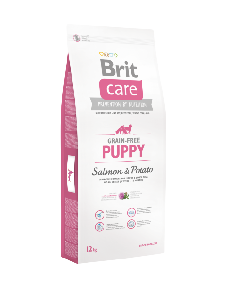 Jednym z produktów marki, jest sucha karma dla psów Brit Care Puppy Salmon & Potato. Z pewnością jest ona dobrym rozwiązaniem dla wszystkich szczeniaków i juniorów wszystkich ras od 4 tygodnia do 12 miesiąca życia. Ponieważ kompozycja karmy opiera się głównie o łososia, który stanowi 35% składu. Przekłada się to finalnie na 30% zawartość surowego białka i 18% tłuszczu w karmie, składników niezbędnych do prawidłowego wzrostu i rozwoju szczeniaka.