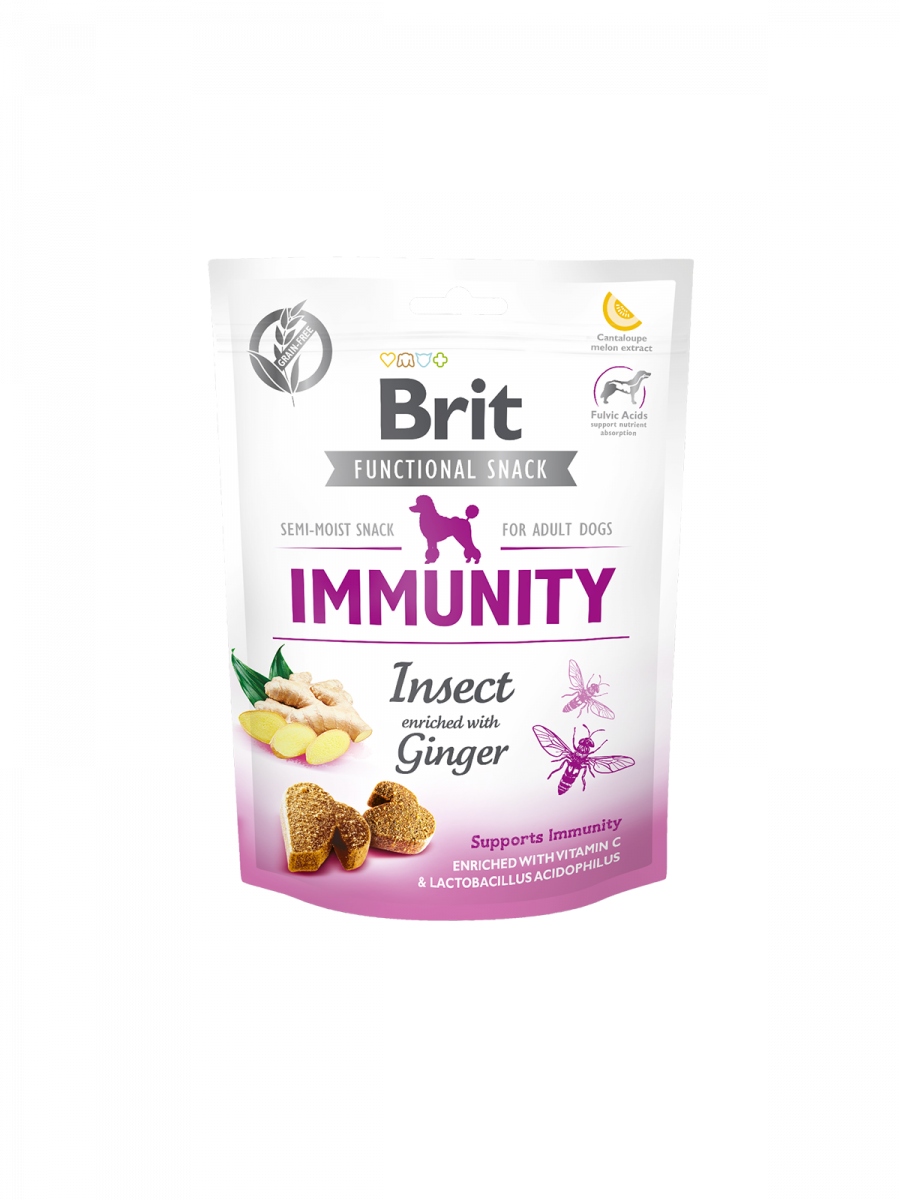 Jednym z produktów marki, są przysmaki dla psów  Brit Functional Snack Immunity Insect – owady. Z pewnością jest ona dobrym rozwiązaniem dla psów wszystkich. Ponieważ kompozycja karmy opiera się w 26% o insekty. Przekłada się to finalnie na 27% zawartość surowego białka i 6% tłuszczu w przysmakach. Owady to źródło wysokiej jakości hipoalergiczznego białka oraz zawera aminokwasy. Dynia zawiera składnki mineralne takie jak: wapno, żelazo, fosfor, magnez i potas. Zawiera ona również witaminy: A, B1, B2, B6, C, E i K. Te minerały i witaminy pelnią rolę ochrronną czyli stymulują wzrost pożytecznej mikroflory lecz wtyma samym czasie hamuje wzrost flory patogennej. Imbir ma działanie przeciwzapalne i antybakteryjne, przez to chronią zdrowie naszych pupili. Co ważne karma ta nie zawiera zbóż, soi oraz składników GMO.