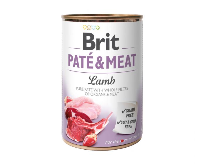Linia mokrych karm dla psów Brit Pate & Meat to 9 zróżnicowanych ze względu na smak karm w puszkach 400g i 800g. W karmie Brit Pate & Meat Lamb głównym źródłem białka jest jagnięcina i kurczak, które stanowią 70% składu karmy. Przekłada się to finalnie na 11% zawartość surowego białka i 9% tłuszczu w karmie.
