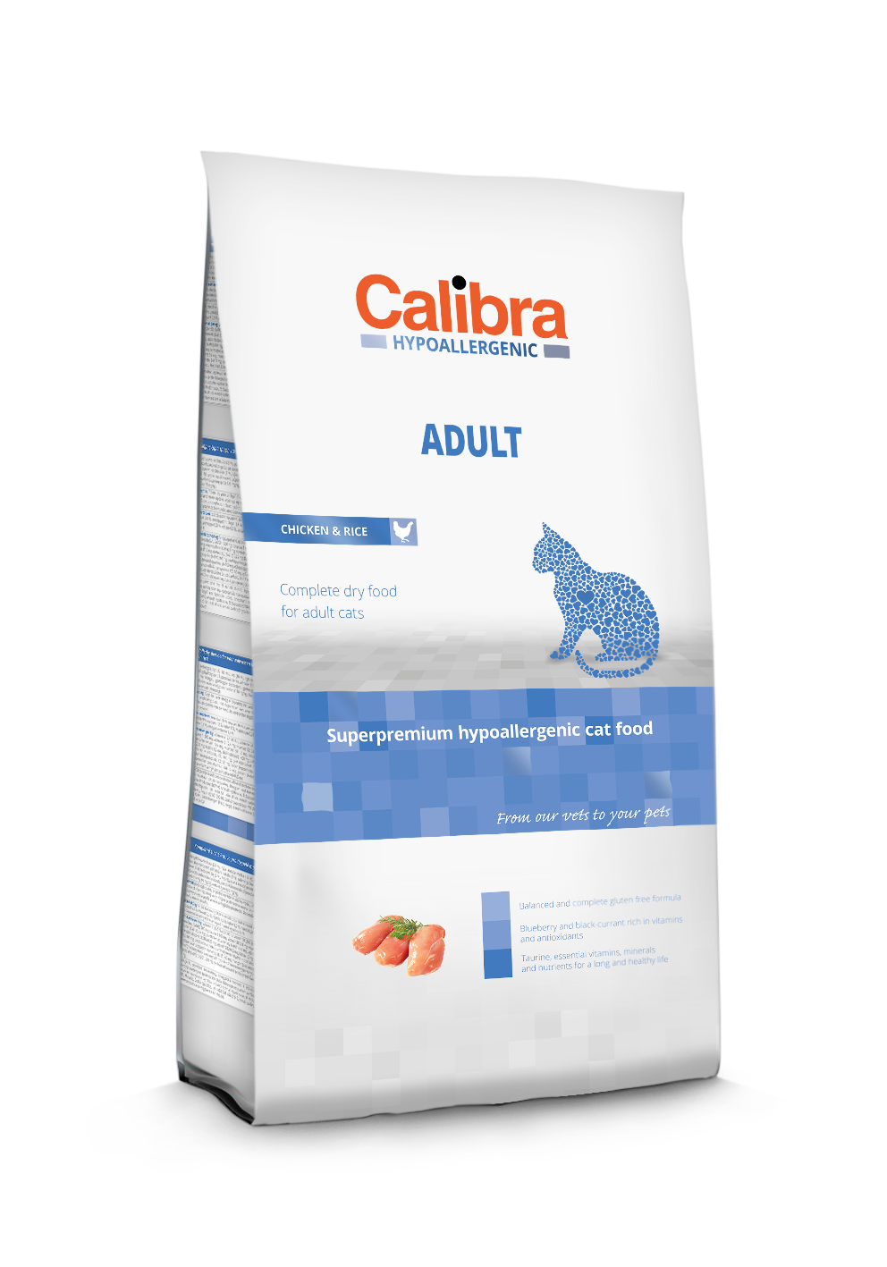 Calibra Adult to dieta dedykowana dla dorosłych kotów. Źródłem białka zwierzęcego w formule jest kurczak. Dzięki temu karma jest bogata w odżywcze, a jednocześnie dietetyczne i doskonale strawne białko, co jest szczególnie istotne dla mięsożernych kotów. Jednocześnie niska zawartość tłuszczu nie dostarcza niepotrzebnych kalorii. Także niska zawartość zbóż ( tylko ryż) oraz odpowiednio dobrana zawartość błonnika pokarmowego powoduje, że formuła jest lekkostrawna i delikatna dla przewodu pokarmowego. Dodatkowo czarne porzeczki i jagody goi zapewniają naturalne antyoksydanty i stanowią bogate źródło witamin .