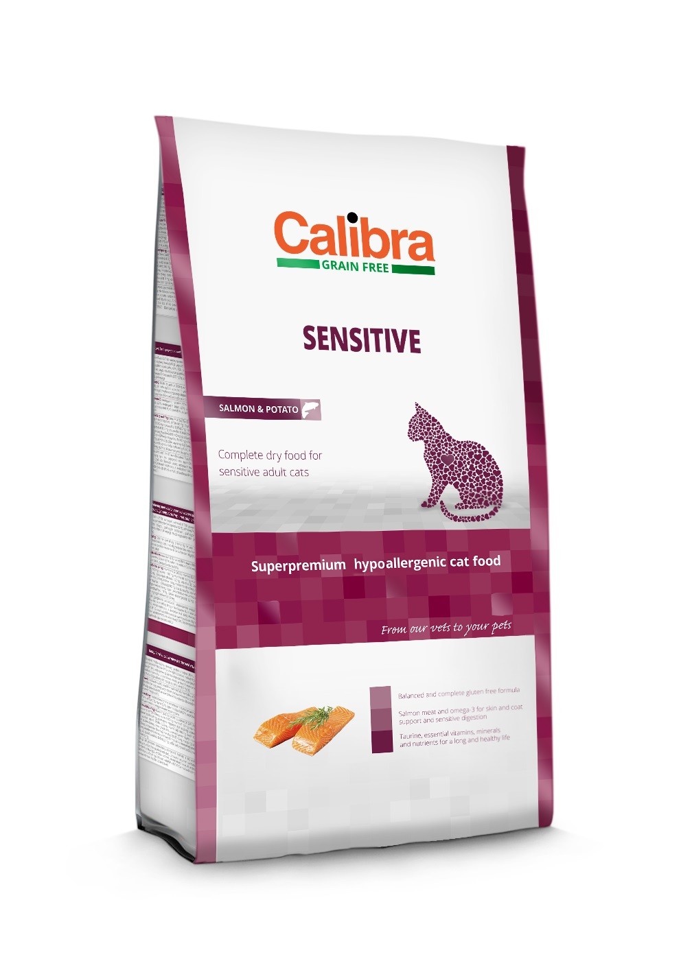 Calibra Cat Sensitive Salmon & Potato to bezzbożowa. hypoalergiczna karma dla dorosłych kotów. Przygotowana z łososia – doskonałe źródło nienasyconych kwasów tłuszczowych Omega 3