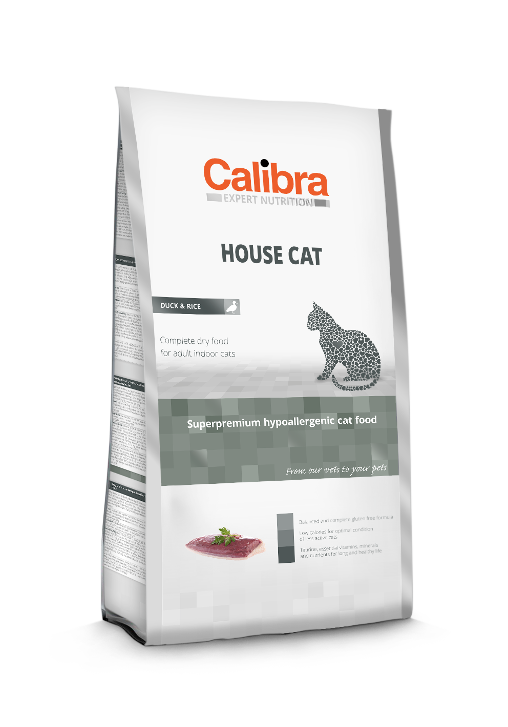 Calibra House Cat Kaczka & Ryż– sucha karma dla kota, to produkt czeskiego producenta. Marka Calibra od 2001 roku tworzy produkty dla zwierząt. Jest efektem wspólnej pracy entuzjastów lekarzy weterynarii. Dlatego założeniem producenta jest promowanie zdrowego i długiego życia zwierząt towarzyszących. W związku z tym skoordynowana współpraca między zespołami składającymi się ze specjalistów ds. żywienia i zdrowia zwierząt, diagnostyki laboratoryjnej, weterynarzy z praktycznym doświadczeniem, technologów i specjalistów produkcji pozwala tworzyć karmy, które spełniają wszelkie potrzeby żywieniowe. Także długofalowa współpraca wiodących specjalistów z uniwersytetów weterynaryjnych w Wiedniu i Berlinie lub instytutów laboratoryjnych i rozwojowych w Republice Czeskiej pozwala tworzyć doskonale zbilansowane formuły dostosowane do każdego etapu życia zwierząt.