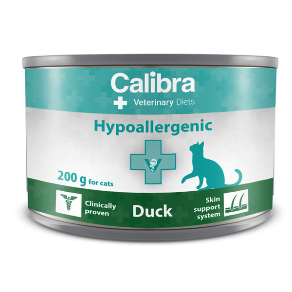 Calibra VD Cat Hypoallergenic Duck to mokra karma dla dorosłych kotów z alergią pokarmową i problemami skórnymi. Duża zawartość mięsa kaczki (aż 67%) zapewnia wyjątkową jakość białka, minimalizując ryzyko reakcji alergicznych. Mięso kaczki jest z pewnością cennym źródłem pełnowartościowego i łatwostrawnego białka. Kaczka jest jednocześnie dobrym źródłem cennych składników odżywczych. W mięsie kaczki znajduje się sporo witaminy A oraz witamin z grupy B. Obfituje ono także w minerały, takie jak magnez, fosfor i żelazo, które jest niezbędne w prawidłowym funkcjonowaniu organizmu. Dodatek mączki grochowej dostarcza niezbędnych węglowodanów, a lignoceluloza wspomaga trawienie. Dodatek bogatych źródeł kwasów tłuszczowych, takich jak: olej rybny, olej lniany, oraz suszone algi, odgrywa istotną rolę w utrzymaniu zdrowej skóry i lśniącej sierści. Pozostałe dodatki funkcjonalne: Jukka mojave, Beta-glukany, mannooligosacharydy oraz fruktooligosacharydy – wspierają układ odpornościowy i kondycję przewodu pokarmowego.