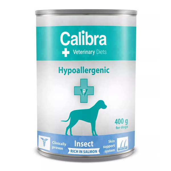 Calibra VD Dog Hypoallergenic Insect&Salmon to mokra karma dla psów z problemami skórnymi i alergią pokarmową. Charakteryzuje się wysoką zawartością składników funkcjonalnych wspomagających kondycję i zdrowie skóry. Bez wątpienia jej dużym atutem jest formuła zawierająca ograniczoną ilość składników oraz rzadko spotykane źródło białka (białko owadzie).