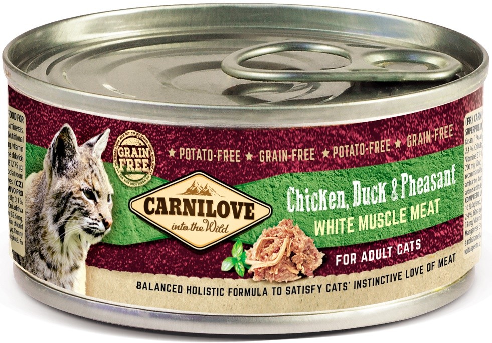Linia mokrych karm dla kotów Carnilove to 11 zróżnicowanych ze względu na smak karm w puszkach 100g i saszetkach 85g. W puszce karmy Carnilove Chicken, Duck & Pheasant głównym źródłem białka jest kurczak, kaczka i bażant, ponieważ stanowi to 55% składu karmy. Przekłada się to finalnie na 10,6% zawartość surowego białka w karmie. Kurczak jako składnik karm dla kotów ceniony jest ze względu na niską zawartość tłuszczu, a także jako źródło aminokwasów i minerałów. Dzięki wysokiej obecności białka z pewnością wpływa korzystanie na prawidłowy rozwój wszystkich tkanek. Kaczka z kolei to cenione źródło białek bogatych w nienasycone kwasy tłuszczowe (PUFA), ponieważ obniżają poziom cholesterolu we krwi. Bażant zaś dostarcza witaminy, fosfor i selen. Z pewnością na uwagę zasługuję fakt, iż karma ta, podobnie jak karmy suche tejże marki, są karmami wolnymi od zbóż oraz od ziemniaków.
