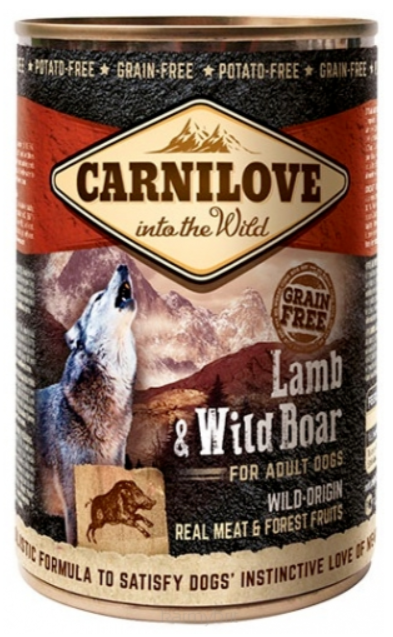 Linia mokrych karm dla psów Carnilove to 14 zróżnicowanych ze względu na smak karm w puszkach 400g i saszetkach 300g. W puszce karmy Carnilove Lamb & Wild Boar głównym źródłem białka jest jagnięcina i dzik, ponieważ stanowi to 67% składu karmy. Przekłada się to finalnie na 10,8% zawartość surowego białka w karmie. Jagnięcina jest cenionym źródłem wysokostrawnych białek, wpływa doskonale na utrzymanie kondycji fizycznej. Niewątpliwie jest to doskonałe źródło mikroelementów, wśród których wymienić można selen, żelazo, cynk, witaminę B i nienasycone tłuszcze. Dzik i jego mięso to wysoki poziom pełnowartościowego białka, które jest źródłem aminokwasów egzogennych. Poza tym charakteryzuje się wysoką zawartością witaminy z grupy B, magnezu, wapnia, fosforu i żelaza. Posiada przy tym niską kaloryczność. Mięso to polecane jest dla psów cierpiących na choroby układu krążenia. Z pewnością na uwagę zasługuję fakt, iż karma ta, podobnie jak karmy suche tejże marki, są karmami wolnymi od zbóż oraz od ziemniaków.