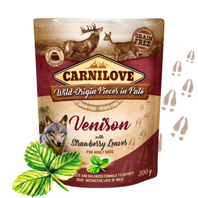 Linia mokrych karm dla psów Carnilove to 14 zróżnicowanych ze względu na smak karm w puszkach 400g i saszetkach 300g. W saszetce karmy Carnilove Venison with Strawberry Leaf głównym źródłem białka jest indyk i dziczyzna, ponieważ stanowi to 85% składu karmy. Przekłada się to finalnie na 9% zawartość surowego białka w karmie.