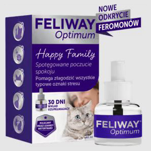 Ceva Feliway Optimum wkład antystresowy, zawiera innowacyjną kombinację składników kocich feromonów, które z pewnością pomagają zmniejszyć uczucie stresu i niepokoju oraz sprawiają, że koty czują się bardziej komfortowo. Feliway Optimum jest zalecany przez lekarzy weterynarii w celu zmniejszenia objawów związanych ze stresem. Niewątpliwie pomaga również w łagodzeniu napięć i konfliktów między kotami oraz ułatwić aklimatyzację nowego kota. Produkt przebadany naukowo o udowodnionej skuteczności.