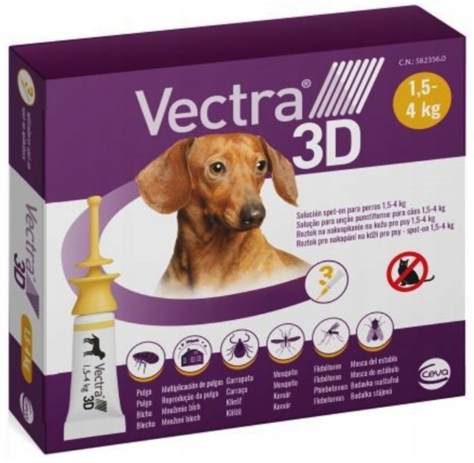Ceva Vectra 3D S to środek przeciw pchłom, kleszczom i komarom dla psów ras miniaturowych, o wadze od 1,5kg do 4kg.