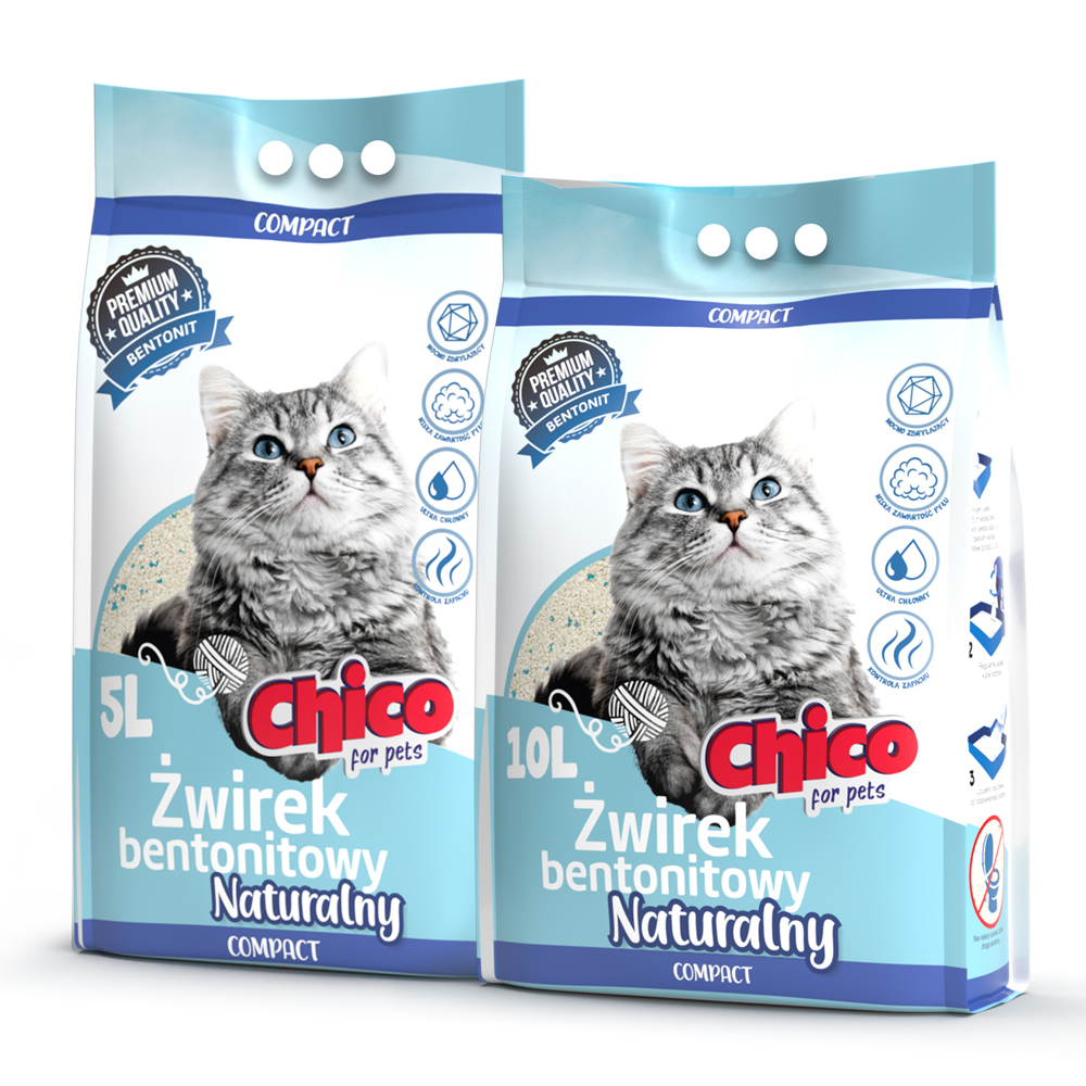 Chico For Pets to nowa jakość w żwirkach bentonitowych. Produkowane z najwyższej jakości białego bentonitu – doskonale pochłaniają wilgoć i nieprzyjemne zapachy. w 99,5% odpylone, z pewnością nadają się dla kocich alergików. Żwirki Chico For Pets są zdobywcą nagrody „Sfinksy” w kategorii „Najlepszy żwirek dla kota”.