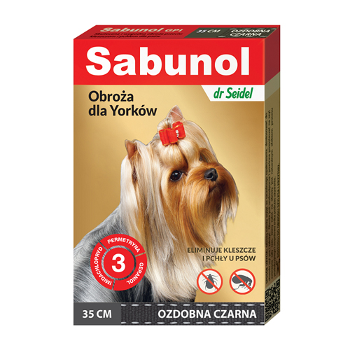 Dermapharm Sabunol GPI Czarna 35cm to ozdobna obroża przeciwko pchłom i kleszczom w kolorze czarnym. Dedykowana rasie Yorkshire terrier, odpowiednia dla wszystkich psów, o podobnej do Yorka wielkości. Ta nowoczesna, skuteczna i wygodna w użyciu obroża zapewnia ochronę przed nową infestacją dorosłymi postaciami pcheł oraz ochronę przed kleszczami przez okres 3 miesięcy.