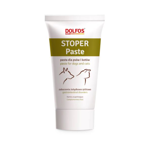 Dolfos Stoper Paste to pasta o kompleksowym składzie do stosowania w przebiegu ostrej biegunki i w okresie rekonwalescencji u psów i kotów. Do stosowania w przebiegu biegunki o różnej przyczynie.