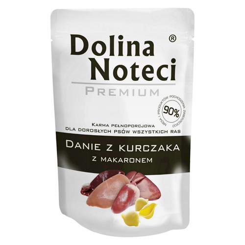 Dolina Noteci Premium Danie z Kurczaka z Makaronem to pełnoporcjowa karma mokra dla psów dorosłych wszystkich ras. Wysokomięsna, aż w 90% przygotowana z mięsa oraz podrobów z kurczaka oraz wołowych, z dodatkiem makaronu. Do tego wolna od zbóż i glutenu