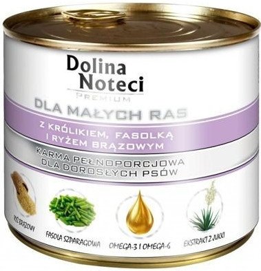 Dolina Noteci Premium z Królikiem, Fasolką i Ryżem Brązowym – przystosowana do żywienia dorosłych psów małych ras. W związku z zawartością królika karma dostarcza do organizmu żelazo, selen, miedź i cynk. Dodatkowo królik bogaty jest także w witaminy z grupy B. Ponadto fasolka szparagowa wzbogaca karmę w żelazo, magnez i miedź. Jest także źródłem włókna pokarmowego.