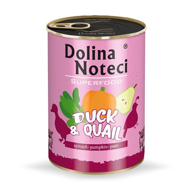 Dolina Noteci Superfood Kaczka i Przepiórka – przystosowana do żywienia dorosłych psów wszystkich ras. 80% receptury stanowi mięso oraz produkty pochodzenia zwierzęcego. Dzięki temu karma jest bogata w doskonałej jakości białko. Szczególnie mięso kaczki odznacza się wysoką zawartością tego składnika. Pomimo iż zalicza się do tłustych mięs posiada bardzo korzystny profil lipidowy. Dodatkowo jest bogate w żelazo, selen i cynk oraz witaminy z grupy B. Natomiast delikatne mięso przepiórki nie zawiera cholesterolu i jest świetnie przyswajane. Dostarcza potasu, miedzi, fosforu i cynk.