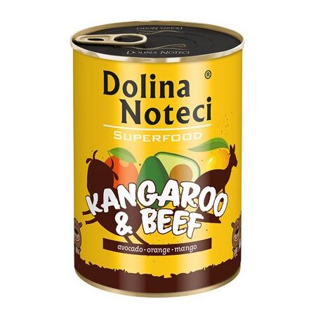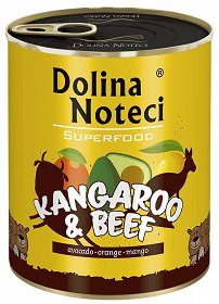 Dolina Noteci Superfood Kangur i Wołowina – przystosowana do żywienia dorosłych psów wszystkich ras. 80% receptury stanowi mięso oraz produkty pochodzenia zwierzęcego. Dzięki temu karma jest bogata w doskonałej jakości białko. Szczególnie mięso kangura, pozbawione antybiotyków i hormonów, wyjątkowo chude i dietetyczne. Dodatkowo zawiera cynk, żelazo, kwasy tłuszczowe EPA i DHA i witaminę B12. Natomiast wołowina zawiera kreatynę, która zwiększa możliwości wysiłkowe, l-karnitynę, która przyspiesza przemianę materii, oraz CLA, który spalić tłuszcz i wpływa na kondycję mięśni. Dzięki temu karma świetnie sprawdza się u psów aktywnych.
