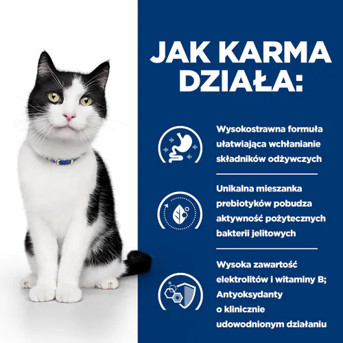 Posiłek przeznaczony dla dorosłych kotów, które mają wrażliwy układ pokarmowy. Zaleca się ją stosować również po zabiegach weterynaryjnych. Specjalnie opracowana formuła jest lekkostrawna, dodatek włókien roślinnych pomaga regulować pracę jelit. Kwasy tłuszczowe wyciszają stany zapalne jelit. Poprawia konsystencję stolca. Białko zawarte w karmie jest dobrze przyswajalne. Zawiera prebiotyki i witaminy i sole mineralne. Karma odznacza się dużą smakowitością.