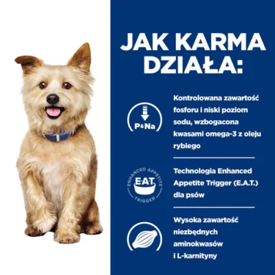 Posiłek stworzony dla dorosłych psów cierpiących na przewlekłą bądź ostrą niewydolność nerek. Karma ma specjalnie obniżony poziom białka oraz fosforu, dzięki czemu nerki nie są obciążone. Białko, które występuje w karmie jest bardzo dobrze przyswajalne. Posiłek wzbogacony jest kompleksem witamin. Karma odznacza się dużą smakowitością.