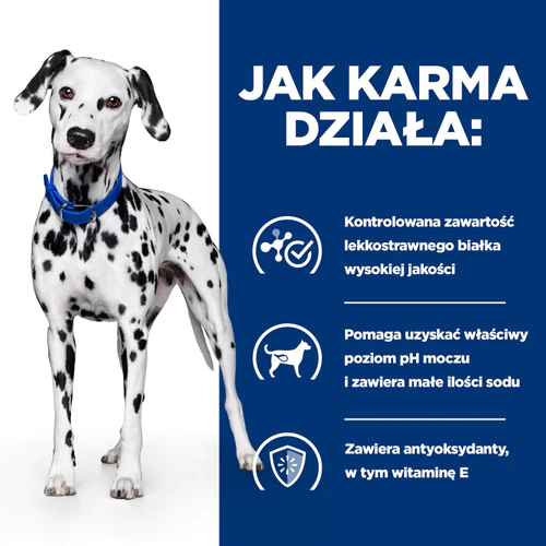 Hill’s U/D jest karmą dedykowaną psom, które mają problemy ze strony układu moczowego. Prawdopodobnie w takich przypadkach konieczna może być zmiana diety. Producent Hill’s wychodzi naprzeciw proponując dietę weterynaryjną U/D. Ze względu na specjalnie opracowaną formułę karma zapewnia równowagę minerałów zapobiegając tworzeniu się kryształów w moczu. Również istniejące już kamienie dzięki podawaniu karmy ulegają rozpuszczeniu. Karma usprawnia pracę nerek. Białko zawarte w karmie jest wyselekcjonowane i łatwo przyswajalne. Dzięki temu nie obciąża nerek. Posiłek zawiera kompleks przeciwutleniaczy oraz witamin.