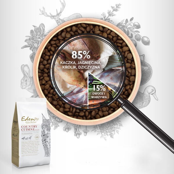 Eden Holistic Country Cuisine jest przygotowana z z wysokiej jakości mięsa kaczki, jagnięciny, królika i dziczyzny. Całkowita zawartość składników zwierzęcych w karmie stanowi aż 85%. Przed odwodnieniem na każde 100g karmy przypada ich 290g. Strawność białka wynosi 88,7%! Bezsprzecznie świadczy to o ogromnej wartości biologicznej składników użytych do produkcji. Tak ogromna zawartość składników zwierzęcych jest szczególnie istotna w żywieniu kotów, które są bezwzględnymi mięsożercami i wyłącznie wysokiej jakości mięsny pokarm spełnia zaspokaja w pełni ich potrzeby żywieniowe.