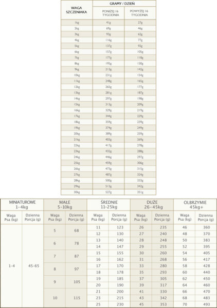 Dodatki żywieniowe na kg: Witamina A 14,425 IU, Witamina D3 1,445 IU, Witamina E 95 mg, Tauryna 960 mg