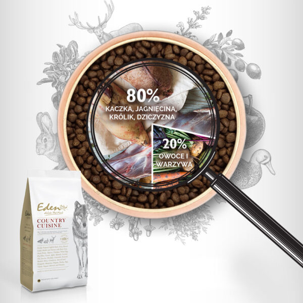 Eden Holistic Country Cuisine jest przygotowana z tradycyjnie hodowanych kaczek Suffolk, jagnięciny z wolnego wybiegu, królików, dziczyzny i jajek. Całkowita zawartość składników zwierzęcych w karmie stanowi aż 80%. Natomiast zawartość białka zwierzęcego w stosunku do białka całkowitego to 97%. Strawność białka wynosi 88,7%! Bezsprzecznie świadczy to o ogromnej wartości biologicznej składników użytych do produkcji.