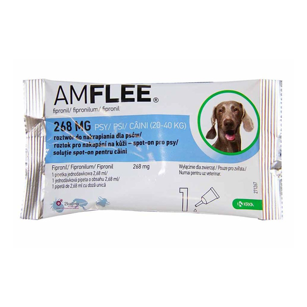 Krka Amflee Spot-On 268mg to środek przeciw pchłom i kleszczom dla psów ras średnich i dużych o wadze od 20kg do 40kg. Produkt zapewnia skuteczną ochronę przed nową infestacją dorosłymi postaciami pcheł przez okres do 2 miesięcy oraz przed kleszczami przez okres do 4 tygodni.