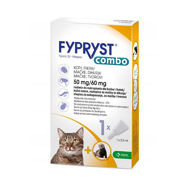 Krka Fypryst Combo Kot to środek przeciw pchłom i kleszczom, dla kotów i fretek. Produkt zapewnia skuteczną ochronę przed rozmnażaniem i nową infestacją dorosłymi postaciami pcheł przez okres do 4 tygodni oraz przed kleszczami przez okres do 2 tygodni. Preparat jest przeznaczony również dla fretek.
