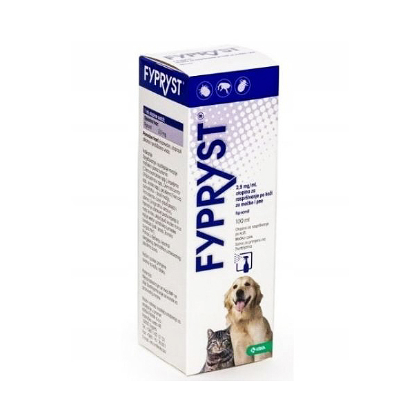 Krka Fypryst Spray to środek przeciw pchłom i kleszczom, dla psów i kotów. Produkt zapewnia skuteczną ochronę przed rozmnażaniem i nową infestacją dorosłymi postaciami pcheł przez okres do 3 miesięcy dla psów oraz do 8 tygodni dla kotów. Zabezpiecza przed kleszczami przez okres do 4 tygodni.