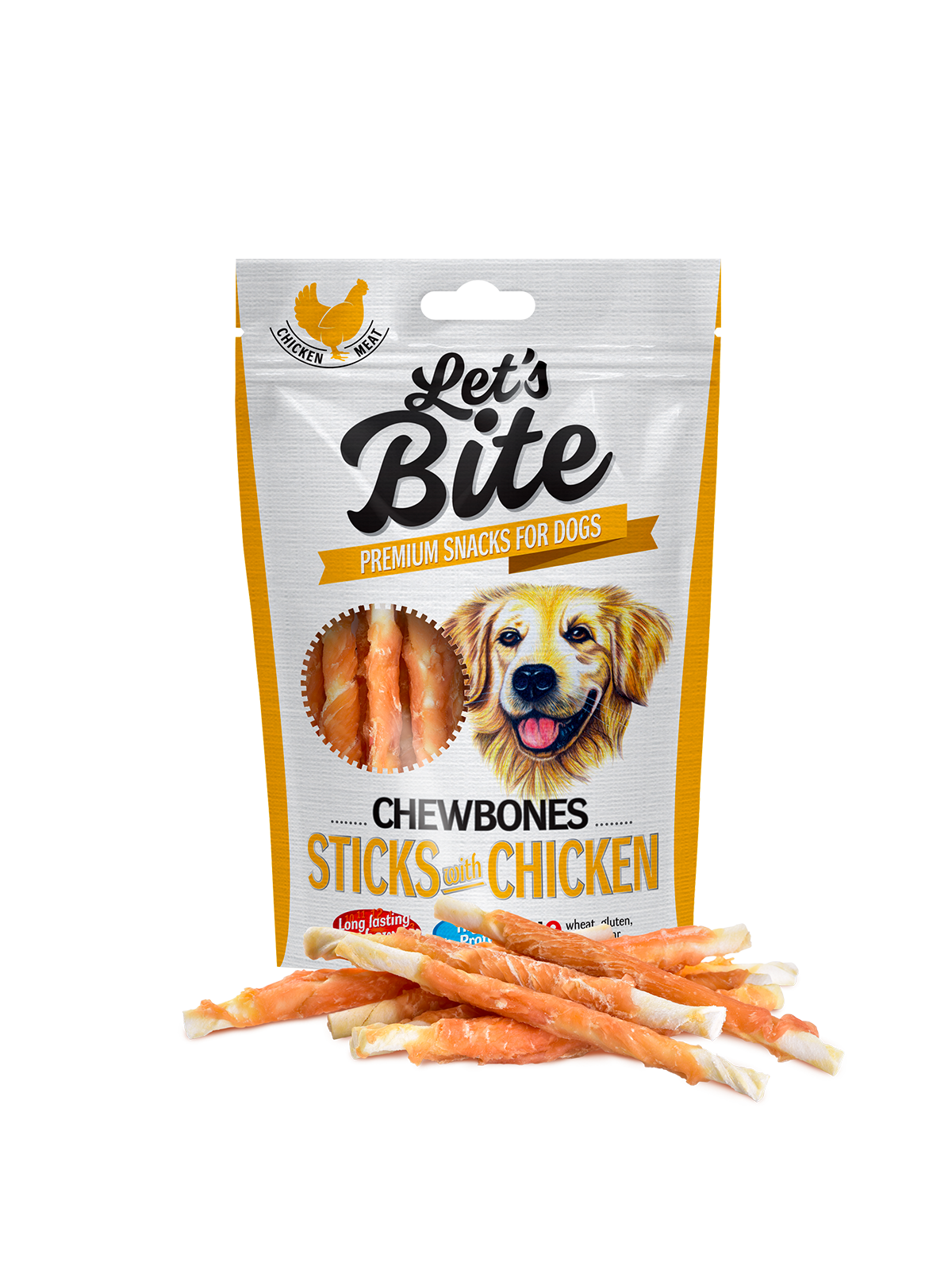 Jednym z produktów marki, są przysmaki dla psów Let’s Bite Chewbones – Sticks with Chicken. Z pewnością jest ona zdrową i dobrą przekąską w ciągu dnia, która pobudza naturalny instynkt żucia u psa. Sprawdzą się one również świetnie podczas treningu. Ponieważ kompozycja tego przysmaku opiera się w 52,8% mięsa z kurczaka. Przekłada się to finalnie na 65% zawartość surowego białka i 3% tłuszczu w przysmakach. Ich wielkim plusem jest to, iż 92,8% składu są to prdukty mięsne. Kurczak to główny składnik karm dla psów ze względu na niską zawartość tłuszczu, a także jako źródło aminokwasów i minerałów. Co ważne karma ta nie zawiera konserwantów, glutenu, cukru oraz składników GMO.