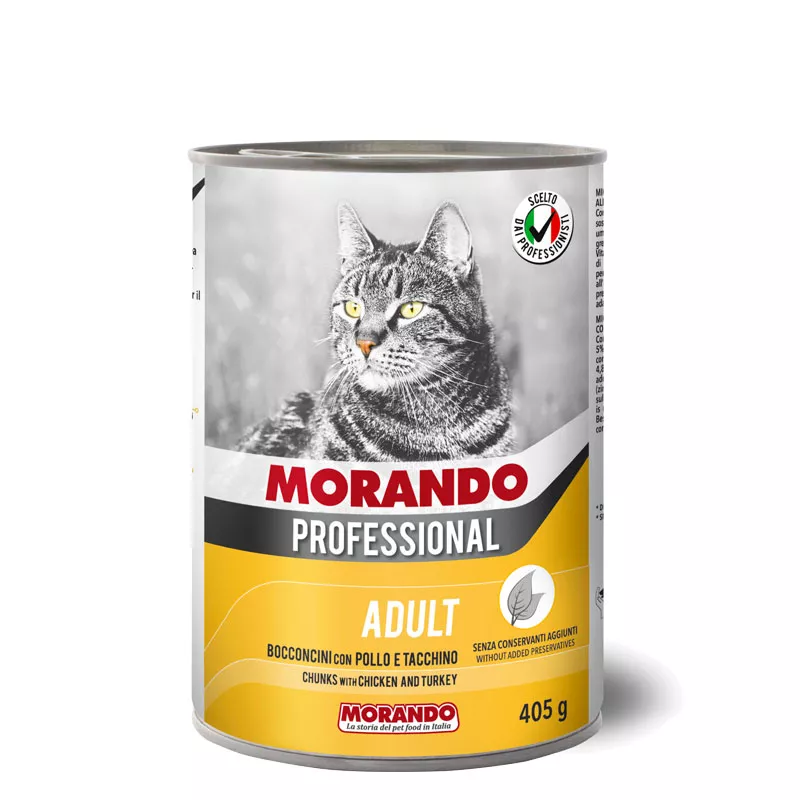 Morando Professional z kawałkami kurczaka i indyka lekkostrawna karma mokra dla dorosłych kotów. W 30% przygotowana z produktów pochodzenia zwierzęcego, zapewnia niezbędne minerały i witaminy, aby zachować najwyższą formę kociego przyjaciela