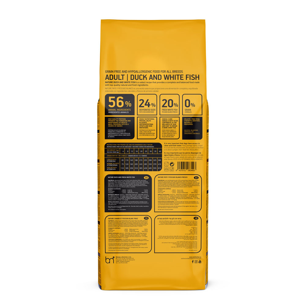 Nature Wild Kaczka i Biała Ryba jest kompletną, zbilansowaną karmą dla psów. W związku z dużą zawartością mięsnych składników zapewnia bardzo dobrze przyswajaną i wartościową dietę. Nie zawiera zbóż ani glutenu. Ze względu na to jest delikatna dla żołądka. Również obecność prebiotyków sprawia, że bardzo dobrze tolerują ją psy z wrażliwym przewodem pokarmowym. Nie zawiera żadnych sztucznych dodatków, barwników i konserwantów.