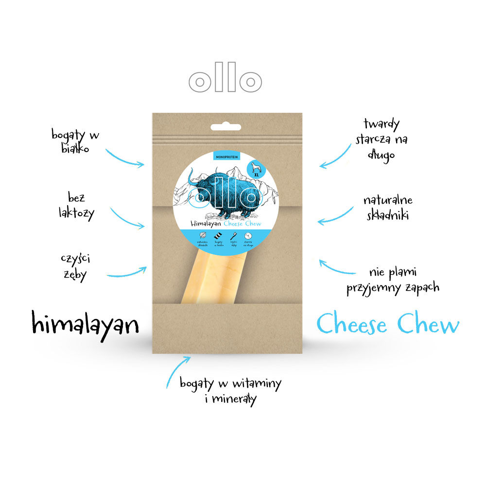 Ollo Himalayan Cheese Chew to twardy gryzak dla wszystkich psów, który w naturalny sposób pomaga utrzymać czyste i lśniące zęby, bez kamienia nazębnego. Wyprodukowany z krowiego mleka od krów z wolnego wybiegu.