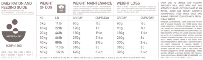 - energia metaboliczna: 3530 kcal/kg, dla optymalnej kondycji psa: 39% energii z białka, 19% z warzyw i owoców, 42% z tłuszczów.