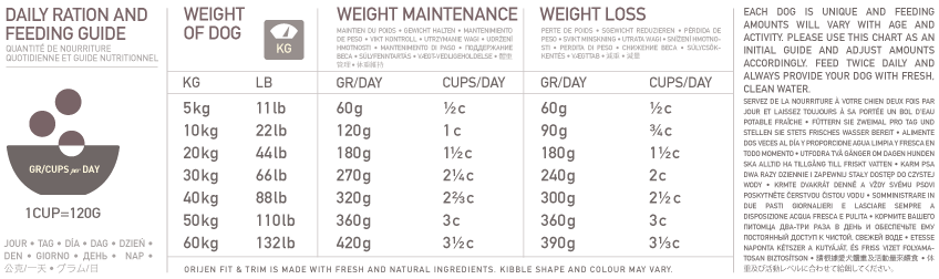 Orijen Fit & Trim to karma specjalnie stworzona z myślą o wszystkich psach psach. Opiera się ona o białko z mięsa kurczaka i indyka, jajka, jak i ryby takie jak śledź, makrela, morszczuk oraz flądra z krystalicznie czystych wód Kanady. Idąc dalej, aby zapewnić naszemu psu jak najlepszy posiłek, w opakowaniu suchej karmy Orijen Fit & Trim, nie znajdziemy zbóż, ziemniaków, tapioki ani roślinnych koncentratorów białka. Pełna będzie ona mięsa, bo aż 85% składu, zaś warzyw, owoców i ziół znajdziemy w niej do 15%. Do tego 2/3 mięsa to mięso świeże, a tylko 1/3 to mięso dehydratyzowane w temperaturze 90˚C. Orijen Fit & Trim zawiera 38% odżywczego białka i jedynie 19% węglowodanów niskoglikemicznych. Wszystko po to aby nasz pies odżywiał się zgodnie z potrzebami biologicznymi.