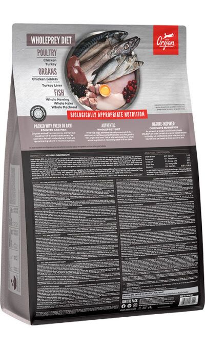 Orijen, jako karma Biologicznie Odpowiednia, stara się odwzorowywać jak najbardziej naturalną dietę psa, tak jak uczyniłaby to Matka Natura. Dlatego też karmy Orijen, bogate są w świeże, mięsne składniki, uzupełniane o owoce, warzywa i zioła. Właśnie dlatego w workach karmy znajdziemy aż 85% mięsa – bezkonkurencyjna ilość względem karm dostępnych na rynku. Między 38%, a 44% białka pochodzenia zwierzęcego. Karmy Orijen przygotowywane są z 8 różnych świeżych i surowych mięs, wszystko zgodnie z proporcją WholePrey™ (cała zdobycz), dzięki czemu organizm otrzymuje odżywcze i różnorodne białka i tłuszcze.
