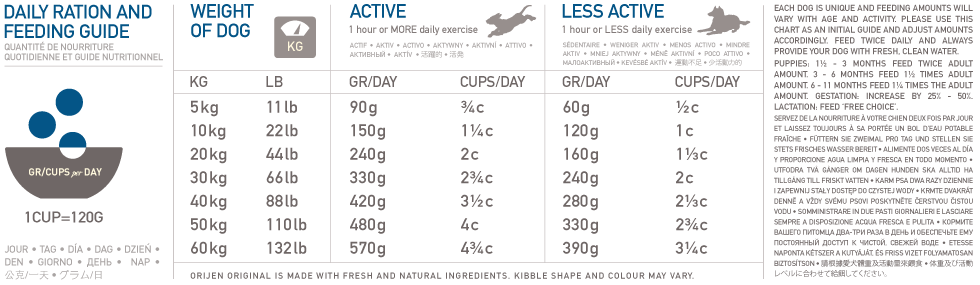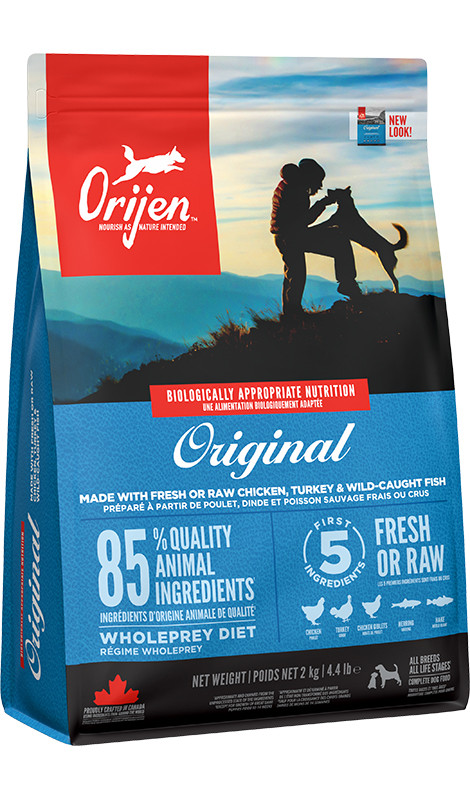 Orijen Original to karma specjalnie stworzona z myślą o wszystkich psach psach. Opiera się ona o białko z mięsa kurczaka i indyka, jajka, jak i ryby takie jak śledź oraz flądra z  krystalicznie czystych wód Kanady. Idąc dalej, aby zapewnić naszemu psu jak najlepszy posiłek, w opakowaniu suchej karmy Orijen Original, nie znajdziemy zbóż, ziemniaków, tapioki ani roślinnych koncentratorów białka. Pełna będzie ona mięsa, bo aż 85% składu, zaś warzyw, owoców i ziół znajdziemy w niej do 15%. Do tego 2/3 mięsa to mięso świeże, a tylko 1/3 to mięso dehydratyzowane w temperaturze 90˚C. Orijen Original zawiera 38% odżywczego białka i jedynie 19% węglowodanów niskoglikemicznych. Wszystko po to aby nasz pies odżywiał się zgodnie z potrzebami biologicznymi.