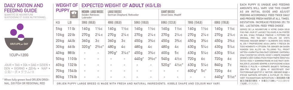 Orijen Puppy Large jest dedykowaną karmą suchą dla szczeniaków ras dużych i olbrzymich.Opiera się ona o białko z mięsa z kurczaka i indyka, jajka, jak i ryby takie jak śledzia i flądre z krystalicznie czystych wód Kanady. Skład karmy ma na celu dostarczenie młodemu psu, kompletnego zestawu niezbędnych składników, do tego wszystko we właściwych proporcjach. Celem karmy jest sprawienie aby psiak mógł w pełni sił wkroczyć w dorosłe życie. W opakowaniu suchej karmy Orijen nie znajdziemy zbóż, ziemniaków czy tapioki. Za to pełna będzie świeżego mięsa kurczaka i indyka, całych jaj ściółkowych, flądry, śledzia oraz zestawu podrobów. Zatem proporcja mięs do warzyw, owoców i ziół wynosi 85 do 15. Do tego 2/3 mięsa to mięso świeże, a tylko 1/3 to mięso dehydratyzowane w temperaturze 90˚C. Orijen Puppy Large zawiera 38% odżywczego białka i jedynie 20% węglowodanów. Tak ułożony przepis na karmę sprawia iż nie jest potrzebna psu dodatkowo suplementacja.